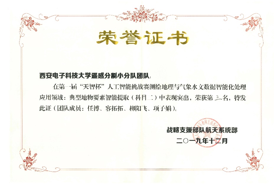 2019年12月19日,第一届“天智杯”人工智能挑战赛决赛在北京成功落下帷幕。“测绘地理与气象水文数据智能化处理应用”主题科目二中,在我校vwin德赢ac米兰官方网侯彪教授和任博老师带领下,vwin德赢ac米兰官方网“遥感分割小分队”荣获全国总决赛季军。