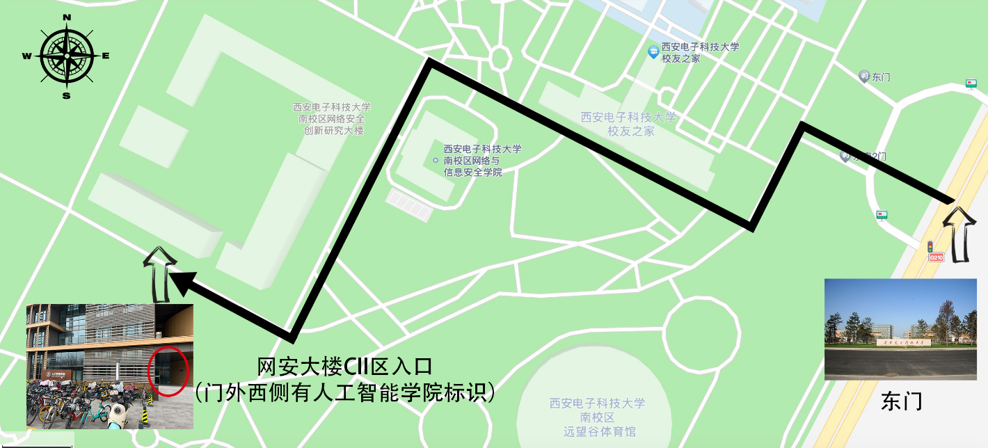 德赢官网将于3月30日进行2024年研究生招生考试综合面试,学院位于网安大楼南侧,入口处有学院标志牌,从学校东门进入后到达学院路线图如下: