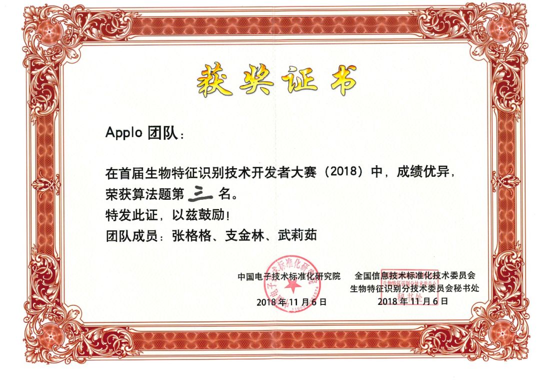 据悉,大赛历时两个多月,吸引了174支队伍,共计320人参加,算法题通过AUC指标对算法的性能进行排名,初赛选取前20进入复赛,Applo团队在初赛阶段就以第5名的成绩,成功入围复赛,复赛阶段,除了AUC指标的算法排名,还需要提交依据GB/T26237.5-2014《信息技术 生物特征识别数据交换格式 第5部分:人脸图像数据》标准生成“人脸数据记录单元”用于标准符合性测试,在通过标准符合性测试的团队中,取前3入围决赛,参与现场答辩,以复赛排名70%和答辩30%的比例进行最终成绩的加权,经过激烈的角逐,vwin德赢ac米兰官方网硕士研究生张格格所在队伍Applo取得了大赛季军,颁奖典礼在11月6日举办的全国信标委生物特征识别分委会(TC28/SC37)2018年全会上作为会议上的一个重要环节进行,与会领导为西电智能学子颁发获奖证书。