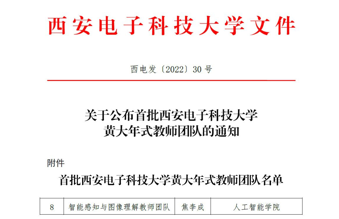 近日,学校印发《关于公布首批vwin德赢ac米兰官方网黄大年式教师团队的通知》(西电发〔2022〕30号),认定全校8个教师团队为首批vwin德赢ac米兰官方网黄大年式教师团队,vwin德赢ac米兰官方网焦李成院士带领的“智能感知与图像理解教师团队”入选。