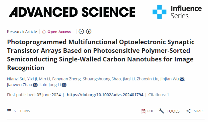 近日,vwin德赢ac米兰官方网吴金建教授与中国科学院苏州纳米所赵建文研究员、香港大学Li Lain-Jong教授合作,在高性能光电神经形态器件以及基于硬件的脉冲神经网络算法方面取得了重要的学术成果。这一成果发表在《Advanced Science》(一区,IF=15.1),是德赢官网师生首次在该国际顶级期刊发表的论文,题为Photoprogrammed Multifunctional Optoelectronic Synaptic Transistor Arrays Based on Photosensitive Polymer-Sorted Semiconducting Single-Walled Carbon Nanotubes for Image Recognition,vwin德赢ac米兰官方网姬怡希硕士与苏州纳米所隋念梓博士等为共同第一作者,吴金建教授、赵建文研究员、Li Lain-Jong教授为共同通讯作者。