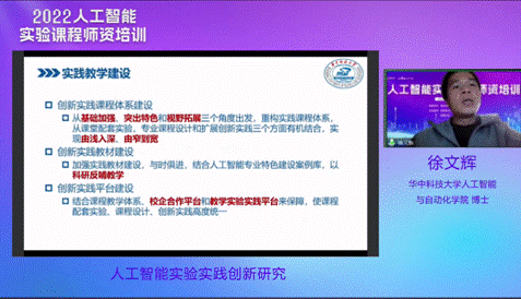 华中科技大学人工智能与自动化学院徐文辉博士带来题为“人工智能实验实践创新研究”的报告。他首先介绍了学校人工智能创新实践课程体系建设思路,通过“大类课程为基础、专业课程为核心、问题和需求为导向”,体现强基、固本、拓展的创新能力培养目标。课程建设过程中,加强与先进高校和企业的交流,依托学院基础突出优势,实践平台建设中采用多层次、开放式的架构,创新内容设计,服务于产业升级转型。课程团队在《数字图像处理》和《模式识别与机器学习》传统课程设计基础上,结合实际场景需求,增加点云、图像、视频等相关的人工智能应用实验。同时,结合科研项目设计实验题目,增强学生学习兴趣,提供经典算法和资料推荐,都对学生形成良好的实践解决方案提供了帮助。