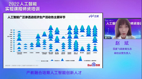 百度飞桨教育生态高校运营负责人赵斌做了题为“产教融合培育人工智能创新人才”的分享。她首先介绍了百度飞桨的建设初衷和发展历程,目前飞桨具有便捷的深度学习框架、超大规模的深度学习模型训练技术、多端多平台部署的高性能推理引擎、产业级开源模型库等,得到了高校和企业的广泛应用和认可。结合人工智能人才需求大、学科交叉性强、与产业结合紧密等特点,百度飞桨以学生实践能力和综合素质培养为目标,促进校企共同体建设,构建产教融合的人才培养体系,包括多适配性的课程体系及立体化教学资源、海量数据集和案例库、丰富的师生服务等,有效助力高校人才培养。