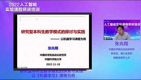 中国科学院自动化研究所张兆祥研究员带来“研究型本科生教学模式的探索与实践:以《机器学习》课程为例”的报告。他对团队机器学习领域的学术基础和研究成果进行介绍。在课程教学方面,实验环节设计与项目研究相结合,帮助学生在各种应用场景中开展实践,相关成果在国内外学科竞赛中取得了优异成绩。接下来,他从机器学习这门课程的特点出发,给大家分享如何把握“经典与前沿并重”、“理论与实践并重”、“教学与研讨并重”,从实际问题出发,基于经典的优化案例,紧跟国际前沿研究成果,帮助学生掌握良好的问题解决方法。最后,他对学生在艺术创作、辅助驾驶等方面的优秀应用成果进行展示。科研项目和竞赛题目融入实验实践培养的优秀案例,为高校人工智能人才的创新能力培养起到很好示范作用。