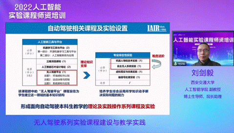 西安交通大学vwin德赢ac米兰官方网刘剑毅副教授做了题为“无人驾驶系列实验课程建设与教学实践”的报告。作为涉及人工智能诸多技术的综合案例,无人驾驶落地本科生教学具有重要意义。课程团队在无人驾驶平台建设基础上,开设了《机器人导航技术实验》《自主无人系统实验》等,形成面向自动驾驶本科生教学的理论及实践操作系列课程。围绕人工智能教学资源建设目标,分别以“教材、教具、教案、教场”为抓手,丰富资源建设内涵,通过实验案例和考核评价机制的优化设计,保证了人工智能本科专业人才的培养效果。