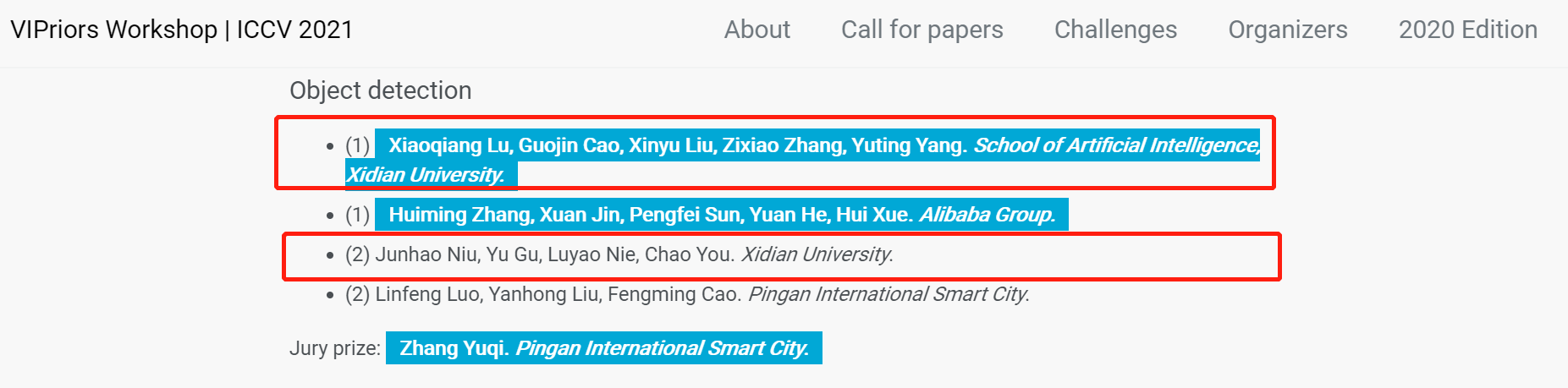 其中,由2020级硕士研究生“路小强,曹国金,刘昕煜,张紫霄”组成的学生团队获得了ICCV 2021 VIPriors Object Detection Challenge目标检测赛道冠军。