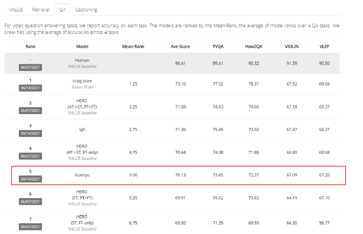 视频问答任务最终排行榜(第五名)