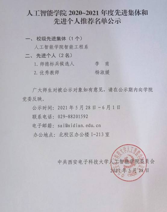 按照学校《关于评选2020~2021年度先进集体和先进个人的通知》(西电党教工〔2021〕3号)文件要求和学院工作安排,经各单位酝酿推荐,学院党委会集体研究,vwin德赢ac米兰官方网2020~2021年度先进集体和先进个人拟荐名单如下,现按照有关规定予以公示。